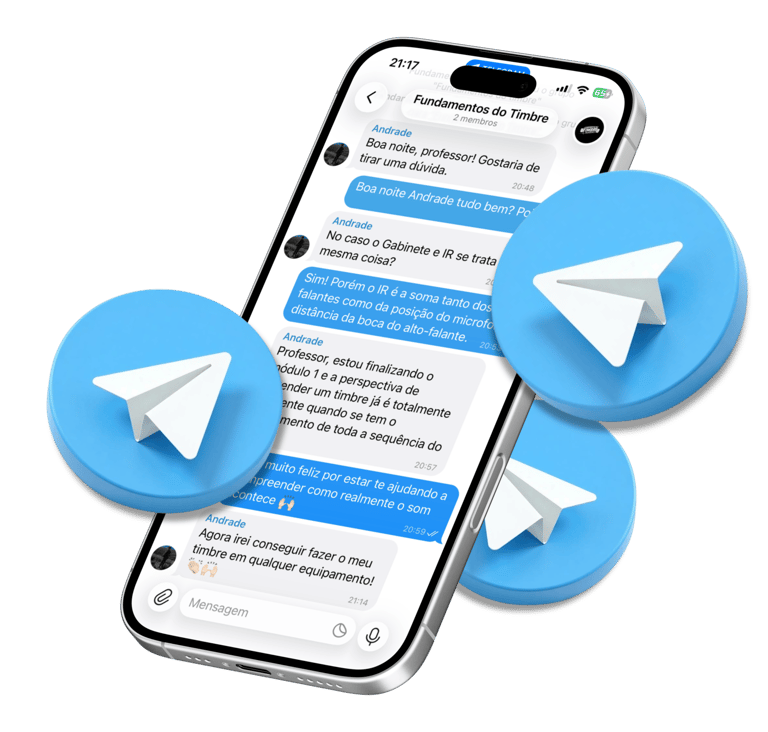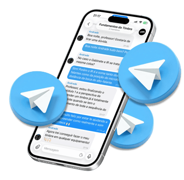 Você vai ter acesso a uma Grupo Fechado no Telegram, exclusivo para alunos, onde você vai ter todo o meu suporte, seja para dúvidas do curso, seja para outras questões do mundo da guitarra.